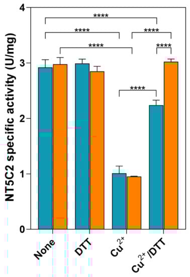 Effect of oxidative stress on the activity of recombinant WT and C547A NT5C2. The activity of recombinant NT5C2, both the WT (blue bars) and C547A mutant (orange bars), was measured after incubation in the absence (none) and the presence of either 5-mM dithiothreitol (DTT) or of 300-µM CuCl2 (Cu2+). The activity was also measured after the addition of 5-mM DTT to the mixtures treated with 300-µM CuCl2 (Cu2+/DTT). Results are the mean ± SD of at least three independent experiments. Statistical significance: **** p ˂ 0.0001.