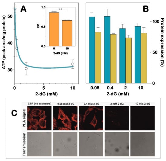 We previously demonstrated by PLA and coimmunoprecipitation that NT5C2 can interact with IPAF in A549 cells [24]. Recently, it was also observed that the incubation of A549 cells with 2-dG, a good inhibitor of both glycolysis and the pentose phosphate pathway [35], causes oxidative stress by lowering the energy charge and increasing the mitochondrial oxidative stress [8]. Additionally, the NT5C2 activity decreased as a consequence of oxidative stress, which determined an irreversible inactivation of the enzyme [8]. Therefore, we incubated A549 cells in the presence of increasing concentrations of 2-dG, a condition that stabilizes a less active enzyme conformation [8]. Figure 4A shows that, as expected, the incubation with increasing concentrations of 2-dG causes a decrease of the ATP content in A549 cells. Although both IPAF and NT5C2 are expressed in A549 cells, and the presence of 2-dG, at a concentration ranging from 0.08 to 10 mM, does not cause a decrease of both proteins (Figure 4B), NT5C2 and IPAF lose the ability to interact in a 2-dG concentration-dependent manner (Figure 4C). This indicates that the conformational change of NT5C2, which occurs as a consequence of the change in the energy charge and oxidative stress, prevents protein–protein interactions.