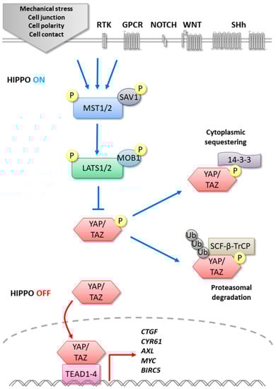 The Hippo pathway, initially discovered in Drosophila, is a well-conserved evolutionary signaling pathway involved in tissue development and regeneration that controls organ size by regulating cell proliferation and apoptosis [1,2]. Physiologically, the Hippo pathway acts as a tumor suppressor, and the mutations found in different pathway actors induce hyperplasia [3]. The core kinases of the Hippo signaling pathway in mammals is composed of MST1/2 (Mammalian STE20-like protein kinase 1/2) and LATS1/2 (Large tumor suppressor 1/2) corresponding to Hpo (Hippo) and Wts (Warts) in Drosophila [4] (Figure 1). The role of these kinases is to regulate negatively the transcription cofactors YAP (Yes-Associated Protein 1) and its ortholog TAZ (Transcriptional co-activator with PDZ-binding motif) corresponding to Yki (Yorkie) in the fly. After receiving activating upstream signals, the pathway is initiated by the activation of MST1/2 associated with SAV1 (Salvador). This complex stimulates by phosphorylation LATS1/2 and its cofactor MOB1, which in turn phosphorylates the transcription cofactors YAP/TAZ, leading to inhibition of its nuclear translocation. In fact, phosphorylated YAP/TAZ is sequestrated in the cytoplasm by 14-3-3 protein. Furthermore, YAP/TAZ stability can be affected via its phosphorylation by the LATS/CK1(ε/δ) (Casein kinase 1 ε/δ) complex, inducing its ubiquitination by the recruitment of E3 ubiquitin ligase SCF-β-TrCP (Skp1-Cul1-F-box β-transducin repeat-containing protein), leading to YAP/TAZ degradation by the proteasome. On the other hand, when the Hippo pathway is inactivated, the unphosphorylated YAP/TAZ complex is translocated to the nucleus, where it binds the TEAD (TEA domain) transcription factor family. Indeed, YAP/TAZ association with TEAD transcription factors is essential to the control of several targeted genes such as MYC (MYC proto-oncogene bHLH transcription factor), BIRC5 (baculoviral IAP repeat containing 5), AXL (AXL receptor tyrosine kinase), CTGF (Connective Tissue Growth Factor), or CYR61 (Cysteine Rich Angiogenic Inducer 61) involved in cell proliferation and survival [5].