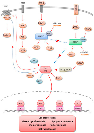 - Li, W.; Dong, S.; Wei, W.; Wang, G.; Zhang, A.; Pu, P.; Jia, Z. The role of transcriptional coactivator TAZ in gliomas. Oncotarget 2016, 7, 82686–82699. [Google Scholar] [CrossRef][Green Version]