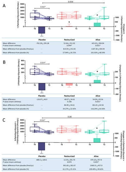 Evolution of plasmatic levels for 1-Palmitoyl-glycerol (A), 2-Palmitoyl-glycerol (B), and the combination of the 2 isomeric forms (C) following the intervention. Purple color was used for the placebo group, pink for the pasteurized group and green for the alive group. Differential values (mean difference and mean difference from placebo) are expressed as the mean ± s.e.m., either as raw data or as percentages. The “- -” in the table refers to “non applicable”. The bars represent the delta per group with the corresponding s.e.m., which corresponds to the mean difference between the value at the end of the intervention and the baseline value. Two-tailed Mann–Whitney U-tests were performed to compare the differential values of both treated groups versus the placebo group (intergroup changes). Below each plot are indicated the respective p-values and when the test is significant, the bars are marked with an asterisk. The horizontal lines represent the evolution of the raw values before and after the intervention. The box-and-whiskers plot illustrates the distribution of the raw values for each timing within each group. The line in the middle of the box is plotted at the median, while the superior and inferior limits of the box correspond to the 75th and the 25th percentiles, respectively. The whiskers correspond to the maximum and minimum values. Two-tailed matched-pairs Wilcoxon’s signed-rank tests were performed to verify changes from baseline (intragroup changes). When the difference is significant, a capped line is marked above the relevant group with the corresponding p-value. Changes between 0 and 3 months across the 3 groups were analyzed with Kruskal–Wallis test; group-wise comparisons were performed using Dunnet’s corrections for multiple testing. When the difference is close to significant, a line is marked above the relevant groups with the corresponding p-value. Placebo group, n = 11; pasteurized bacteria group, n = 12; alive bacteria group, n = 9. * p < 0.05.