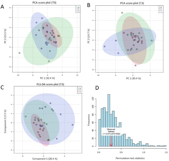 (A,B) 2D PCA Score plot for comparison of the global eCBome profile at baseline (A) and following the intervention (B) according to the group. (C) 2D PLS-DA cross-validated score plot for comparison of the global eCBome profile between groups following the intervention (time 3 months). The semi-transparent area is the 95% confidence region for each group. Variance explanation (%) for each PC/component is indicated. Color code: green ellipses correspond to the placebo group; blue ellipses correspond to the pasteurized group; red ellipses correspond to the alive group, with each dot representing one participant. (D) Result of the permutation test with separation distance (B/W) select for a statistical test, set permutation numbers: 1000. Analyses and graphs were performed and generated using MetaboAnalyst v4.0 (26 November 2020). Placebo group, n = 11; pasteurized bacteria group, n = 12; alive bacteria group, n = 9. Abbreviations: A, alive; N, non-treated (Placebo); P, pasteurized; PCA, principal component analysis; PC, principal component; PLS-DA; partial least square discriminant analysis; T0, time 0 month; T3, time 3 months.