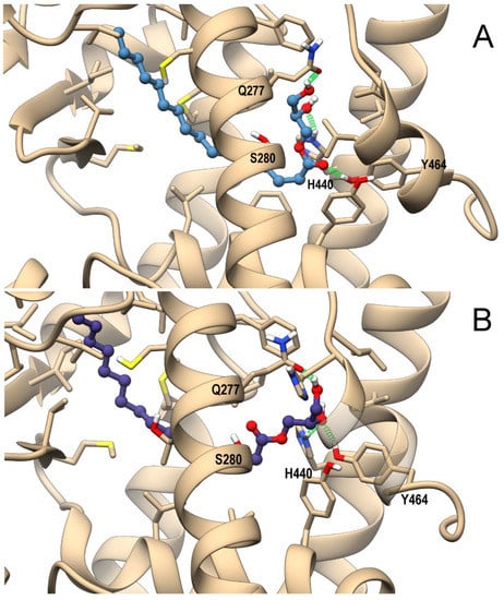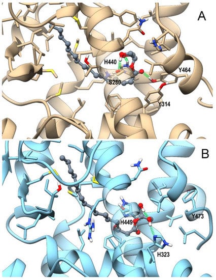 As for 2-PG, both 1-PG enantiomers engage in PPARα H-bonds with H440 (H10/11), Y464(H12), and S280(H3) within the ligand-binding domain (LBD), albeit the H-bond with Y464(H12) has a lower occurrence in comparison with 2-PG (<30% vs. ~80%, respectively), due to the carbonyl group flipping between Y464(H12) and Ser280(H3) for D-1-PG and the alternate involvement of the same hydroxy group in H-bond with either Y464(H12) or H440(H10/11) for L-1-PG. The reduced stability of such H-bond in both PPARα complexes could in principle affect the potency of 1-PG toward this receptor in comparison with 2-PG (Figure 6 A,B). As for the PPARγ complex, 1-PG forms stable H-bonds with Y473(H12), differently from 2-PG. In particular, D-1-PG engages H-bonds with both H440(H10/11) and Y473(H12) (Supplementary Figure S5A), even though its alkyl chain does not adopt the typical horseshoe conformation around H3 observed in canonical agonists, pointing instead toward helix 5. The optimal orientation of the alkyl chain is observed in L-1-PG, which, however, does not optimize its polar interaction, being involved in a single intermolecular H-bond with Y473(H12) (Supplementary Figure S5B). Thus, the two enantiomers show different arrangements within the LBD that in principle could reflect a different ability in triggering receptor activation. Of note, 1-PG could not be tested in vitro because it was not commercially available in an enantiomerically pure form.