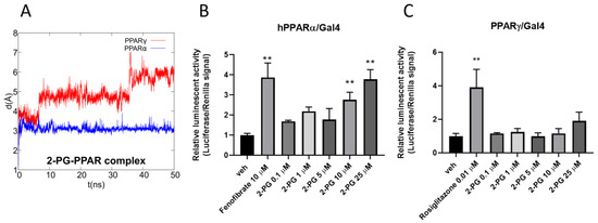 (A) Root-mean-square deviation (RMSD) plot of 2-PG in complex with PPARα/γ over the 50 ns of molecular dynamics (MD) trajectory after best fitting of protein backbones. Luciferase assays performed in PPARα- or PPARγ-transfected COS cells (B,C). Bar graphs showing the ratio between firefly and Renilla luciferase in response to increasing concentrations of 2-PG. Fenofibrate and rosiglitazone were used as positive controls for PPARα (B) and PPARγ (C), respectively. The vehicle group was set to 1; thus, the relative luciferase activities obtained for each tested compound and concentration are presented as fold induction in comparison to the vehicle control. Each point is the mean ± SEM of four separate determinations performed in duplicate. The double asterisk denotes a p-value ≤ 0.005 versus the vehicle group.