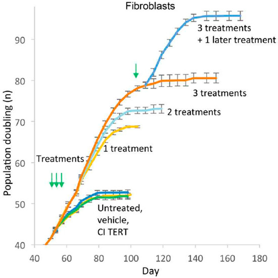Growth curves of human fibroblasts treated once, twice or thrice in succession at 48 h interval with human telomerase (TERT) mRNA, catalytically inactive (CI) TERT mRNA, or vehicle only, shows increase in population doubling [58]. Green arrows indicate the time of treatment.