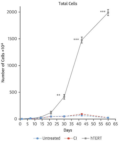 Growth curves of HGPS fibroblasts after 3 treatments with vehicle, transfected HGPS fibroblasts with human telomerase (TERT) or catalytically inactive (CI) TERT mRNA [59]. ** p < 0.01; *** p < 0.001.