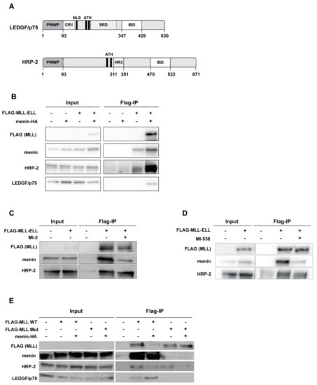 HRP-2 and LEDGF/p75 are the only two human proteins that contain both the PWWP and the IBD domains (Figure 1A) [,]. As both HRP-2 and LEDGF/p75 can fulfil a similar role in HIV infection [,] and LEDGF/p75 is important for MLL-r [,], we investigated the involvement of HRP-2 in hematopoiesis and MLL-mediated transformation. Menin serves as an adaptor to link MLL with LEDGF/p75 and thus is essential for the formation of the triple transcription-regulatory complex []. Here, we investigated the potential interaction of HRP-2 with the MLL-menin complex by in vitro co-immunoprecipitation (IP) in HEK293T cells transfected with flag-tagged MLL-ELL and/or menin-HA expression constructs (Figure 1B–E). The binding of endogenous HRP-2 and LEDGF/p75 was detected using anti-HRP-2 or anti-LEDGF antibodies. Despite the poor detection of flag-MLL-ELL in the precipitate in the absence of ectopic menin expression, it is clear that upon the overexpression of menin and MLL, both HRP-2 and LEDGF/p75 were precipitated. To further clarify whether the binding of HRP-2 to MLL-ELL is dependent on menin, as is the case for LEDGF/p75, we treated cellular lysates with 100 µM of MI-2 [], a previously described MLL-menin interaction inhibitor. In line with previous reports, MI-2 treatment resulted in a partial loss of menin binding upon MLL precipitation (Figure 1C) []. HRP-2 still co-precipitated with MLL upon MI-2 treatment. Similar results were obtained using 50 µM of the more potent MI-538 inhibitor (Figure 1D) []. Since both menin inhibitors did not fully abrogate the MLL-menin interaction, we introduced three point mutations (F9A, P10A and P13A) into a flag-MLL-ELL1–330 (MLL Mut), known to completely abolish binding to menin []. Whereas the MLL mutations did not interfere with the precipitation of HRP-2 (Figure 1E), the MLL mutant failed to co-IP LEDGF/p75 despite the presence of overexpressed menin, suggesting HRP-2 is less dependent on menin for binding to MLL. Interestingly, whereas ectopic overexpression of menin resulted in increased co-precipitation of LEDGF/p75, binding to HRP-2 was reduced, supporting a competition between HRP-2 and LEDGF/p75 for binding to MLL under control of menin (Figure 1B,E).
