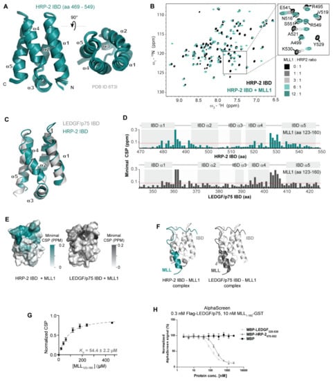 To validate and characterize the direct interaction between HRP-2-IBD and MLL, we followed the changes in positions of backbone NMR signals of 15N-labeled HRP-2-IBD either in absence or presence of different concentrations of a synthetic MLL-derived peptide (amino acids 123-160). MLL123–160 induced significant chemical shift perturbations of the IBD backbone signals (Figure 2B and Figure S1). Moreover, this experiment revealed that MLL recognizes HRP-2-IBD through the same interface and binds with similar affinity as LEDGF/p75 (Figure 2D–H). In particular, the chemical shift perturbations in the IBD backbone induced by binding of MLL123–160 were found in two regions (amino acids 479–492 and 520–535) (Figure 2D). As for the LEDGF/p75 IBD-MLL123–160 interaction [], these regions form two interhelical loops connecting IBD α helices α1–α2 and α4–α5, respectively (Figure 2E,F). Additionally, the analysis of the chemical shift perturbations in the HRP-2 IBD backbone induced by binding of JPO2 (amino acids 1–130) and POGZ (amino acids 1117–1410) revealed a pattern remarkably similar to that induced upon addition of MLL confirming that these protein fragments bind to HRP-2 in the same conserved structural mode as LEDGF/p75 IBD (Figure S2). Importantly, the dissociation constants for the MLL123–160 interaction with HRP-2-IBD (54.4 ± 2.2 µM, Figure 2G) obtained from NMR titration experiments are comparable with those of LEDGF/p75 (64.0 ± 6.5 µM) obtained in our earlier studies []. In addition, HRP-2 and LEDGF/p75 affinities to MLL were compared in an AlphaScreen assay with MBP-fused recombinant C-terminal fragments of LEDGF/p75 (LEDGF325–530) and HRP-2 (HRP-2470–552), purified from E. coli and used to outcompete the interaction between recombinant flag-tagged LEDGF/p75 and GST-tagged N-terminal fragment of MLL (MLL1–160–GST). Unlike MBP alone, both IBD domains of HRP-2 and LEDGF/p75 efficiently outcompeted the interaction between MLL1–160–GST and full-length flag-LEDGF/p75 (Figure 2H). Altogether, our data revealed that the overall binding mechanism used by HRP-2 and LEDGF/p75 IBDs is highly conserved.