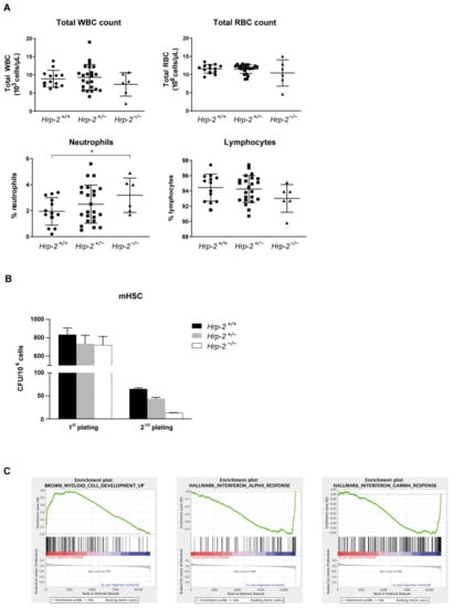 To compare steady-state hematopoiesis between weaned wild type and knockout mice, blood counts were analyzed for the different genotypes. No significant differences were observed in total white and red blood cell count (Figure 3A top), whereas the differential blood count revealed a significant increase in neutrophils in the HRP-2−/− mice compared to the wild type (p = 0.042, Figure 3A bottom). Other cell types did not differ between genotypes (Figure S3B). To explore the functionality of the cells, we sought to compare the colony-forming capacity of HRP-2 wild type, heterozygous and knockout cells using myeloid CFU assays. Lineage depleted (lin-) cells were harvested from HRP-2+/+, HRP-2+/− and HRP-2−/− mice and serially plated. After two rounds of plating, the number of colonies derived from HRP-2−/− and HRP-2+/− bone marrow cells were respectively 80% and 33% lower compared to the wild-type control (Figure 3B).