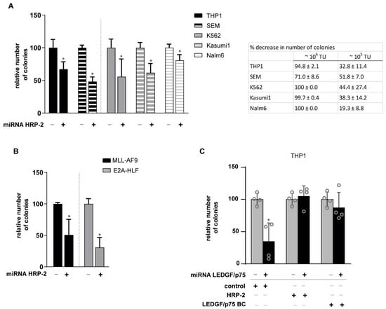 Since HRP-2 depletion affects the clonogenic growth of all leukemic cell lines tested, we investigated whether HRP-2 overexpression could rescue the colony-forming capacity of an MLL-AF9 leukemic cell line (THP1) after LEDGF/p75 depletion. First, we stably expressed miRNA-resistant LEDGF/p75, HRP-2 or a mock control. Subsequently, cell lines were transduced with a miRNA-based lentiviral vector to specifically knockdown Psip1 or eGFP (Figure 4C). Expression levels of Psip1 and HRP-2 in the generated cell lines were verified by qPCR and western blot (Figure S6A,B). In line with previous reports, LEDGF/p75 depletion caused a ~65% decrease in the number of colonies formed compared to the control [,,] (Figure 4C) and this defect was rescued by LEDGF/p75 back-complementation (BC). Of interest, overexpression of HRP-2 fully restored the CFU activity to wild-type levels, indicating that overexpression of HRP-2 can functionally compensate for the absence of LEDGF/p75 in MLL-transformed cells. This experiment was repeated in the MLL wild-type Nalm6 cell line (Figure S6C–E). In line with published data [,], the depletion of LEDGF/p75 did not affect the colony forming capacity of the Nalm6 cell line, as the LEDGF/p75-dependent drop in colonies is MLL-specific. Although both HRP-2 and LEDGF/p75 overexpression increased the colony formation of Nalm6 cells, the effect was not significant.