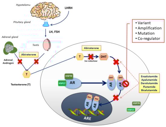 Androgen-dependent signaling through the androgen receptor (AR). After its production in the testes ad the adrenal glands, testosterone (T) is converted by 5α-reductase to dihydrotestosterone (DHT), its active metabolite. Generally, androgens bind to AR, dissociating chaperone proteins, including members of the heat shock protein family (HSP27 and HSP70). Upon homodimerization, ligand-bound AR dimers translocate to the nucleus where they bind to androgen response elements (ARE), acting as transcription factors to downstream targets. AR-directed drugs are illustrated at their points of pathway alteration: Abiraterone disrupts the androgen biosynthesis inhibiting the 17α-hydroxylase/C17,20-lyase (CYP17), an enzime expressed in testicular, prostate, and adrenal tissue; Flutamide, and Bicalutamide, reversibly, and Enzalutamide, Apalutamide, Darolutamide, irreversibly, prevent testosterone binding to the AR, incapacitating its translocation to the nucleus.