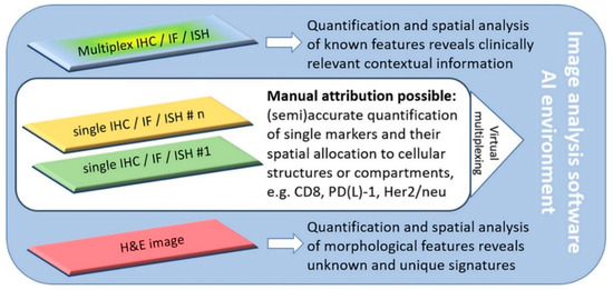 Software-assisted decision support in digital histopathology. Most current problems in routine histopathology can be solved with software-guided image analysis tools. The increasing emergence of complex multiplex analysis allows for the consideration of the tumor heterogeneity and the spatial relationships of various markers. If single-slide multiplexing is not possible due to inconsistent antigen-retrieval or disparate staining protocols, virtual multiplexing is also an option. Novel artificial intelligence (AI) solutions even allow novel and unique signatures from H&E slides to be revealed. Reproduced with permission from J. Pathol. 2020, 250, 685–692, doi:10.1002/path.5388 [8].