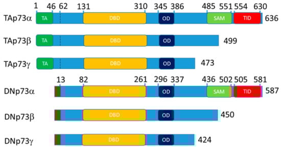 Schematic representation of the p73 domain structure for the main isoform expressed in the epithelial tissue. The p63 follows the same nomenclature. Altogether, 13 isoform of p63 and 13 isoforms of p73 exist. DN- isoforms begin with the stretch of 13 amino acids that replace TA domain at 62 bp. The TAp73a coordinates are for the O15350 protein and DNp73a coordinates are for the BAB87244.1 protein. TA—transactivation domain, DBD—DNA binding domain, OD—oligomerization domain, SAM—sterile alpha motif domain and TID—transcription inhibitory domain.