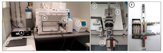 In-house built setup for the mechanical stretch of nerve explants. (A) The controller is connected to GalilTools software and the oscillator (D,E). (B) The incubator chamber keeping constant culture conditions. (C) The gas mixer analyzing the air constitution of the incubator chamber, 5% CO2. (D) The bioreactor (F) is mounted on the oscillator (E). (E) The oscillator is connected to the controller (A) and the bioreactor (F) inside the incubator. (F) Bioreactor. Two metal plates (a and b) are built on a metal rail, and poly-ether-ether-ketone (PEEK) bars are fixed on them by screws and kept in a metal boat filled with culture medium. Metal plate b is connected to the oscillator, moving back and forth, while the other plate is fixed to the stage and the metal rail.
