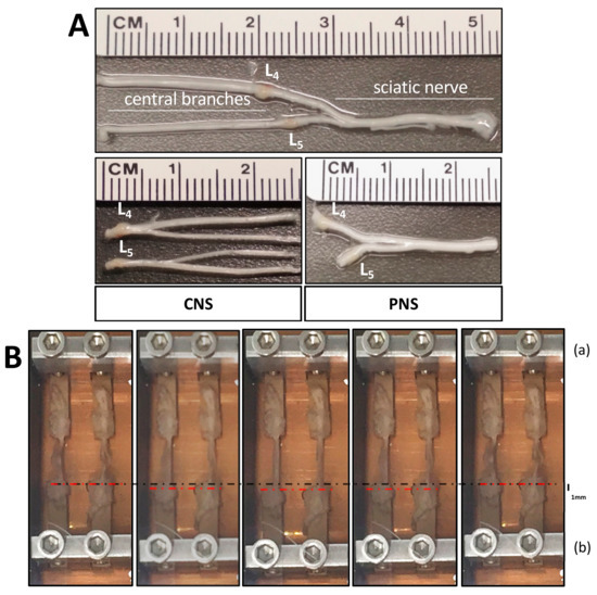 Peripheral nervous system (PNS) and central nervous system (CNS) nerve-dorsal root ganglia (DRG) explants. (A) The L4-L5 DRG are either connected to the sciatic nerve or continue independently along their dorsal roots into the spinal column. Two groups were prepared with either the central nerves connected to their respective L4/L5 DRG or the sciatic nerve connected to the L4/L5 DRG. (B) Explant nerves were glued on two PEEK bars facing towards each other, with the DRG sitting on one bar and the end of the nerve(s) seated on the other bar with a 1 cm distance between them. With the 10% cyclic movement of plate B (lower metal plate), 1 mm dislocation was achieved.