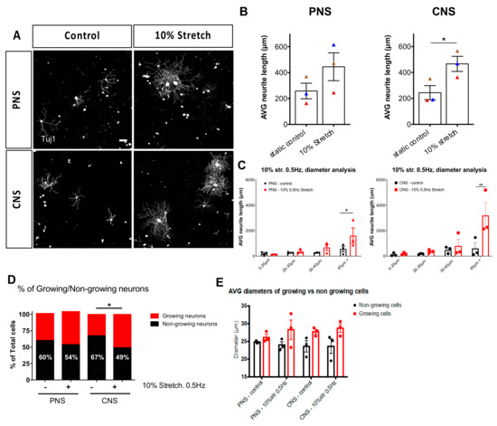 Ex vivo mechanical stretch enhances neurite outgrowth. Three hours following a mechanical stretch of either the sciatic nerve connected to L4-L5 DRG or connected to their respective central nerves, DRG were dissected and cultured for 18 h on laminin substrates. (A) Immunohistochemical staining of βIII-tubulin (Tuj1) was used to trace all neurites of the DRG. Scale bar, 100 μm, (B) 10% mechanical stretch with a frequency of 0.5 Hz enhanced neurite outgrowth of DRG derived from a CNS explant but not from a PNS explant. Paired two-tailed Student t-test, mean ± SEM of paired independent experiments indicated by the colors, * p < 0.05, (C) Diameter analysis of DRG outgrowth comparing the static controls to the stretched explants shows the largest neurons responding to stretch. Two-way ANOVA with post-hoc Sidak’s multiple comparison test, mean ± SEM, * p < 0.05, ** p < 0.01. (D) Quantification of growing vs. non-growing neurons in each group showed that non-growing neurons decreased in the CNS group upon the stretch. Two-way ANOVA with post-hoc Sidak’s multiple comparison test, * p < 0.05. (E) Examination of the average size of growing versus non-growing neurons shows non-growing neurons to be consistently smaller diameters than growing neurons.