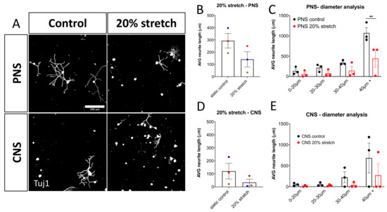 20% 0.5 Hz stretch has a negative impact on neurite outgrowth of DRG in vitro. (A) Representative photomicrographs (10×) of cultured rat DRG following 20% 0.5 Hz stretch or no stretch and stained for βΙΙΙ-tubulin (Tuj1). Scale bar, 200 μm. (B) Neurite length analysis of DRG cultured after 20% 0.5 Hz stretch of PNS-nerve explant compared to static control. Stretch appeared to have a negative impact on the neurite outgrowth, although not statistically significant. Paired two-tailed Student’s t-test, mean ± SEM of paired independent experiments indicated by the colors. (C) Diameter analysis showing a statistically significant reduction in the outgrowth of large-diameter neurons after a 20% stretch of the PNS-nerve explant. Two-way ANOVA with post-hoc Sidak’s multiple comparison test, mean ± SEM, ** p < 0.01, (D) Neurite length analysis of DRG cultured after 20% 0.5 Hz stretch of CNS-nerve explant compared to static control. Stretch appeared to have a negative impact on the neurite outgrowth of these cells as well, although not statistically significant due to high variability. Paired two-tailed Student’s t-test, mean ± SEM of paired independent experiments indicated by the colors. (E) Diameter analysis showing a reduction trend in the outgrowth of all DRG populations after 20% stretch of the CNS-nerve explant. Two-way ANOVA with post-hoc Sidak’s multiple comparison test, mean ± SEM, ** p < 0.01.