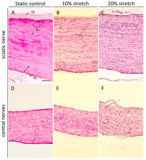 Nerve sections were analyzed histochemically with H&E staining to examine the direct result of our treatment on the cytoarchitecture of the nerves. The cytoarchitecture of the nerves consists of the outermost layer of connective tissue, called epineurium, surrounding the inner layers of the perineurium and the endoneurium, the extracellular matrix and connective tissues surrounding and protecting the nerve fascicles and the individual nerve fibers, respectively. Specific characteristics of the morphology of the sciatic nerve are the undulating course of the nerves and connective tissue in the endoneurium. This results in a wavy structure, described first by F. Fontana in 1781 [24], observed only in peripheral [25] and not central nerves [26,27]. Interestingly, we found that 3 h of mechanical loading with an amplitude of 10% of the sciatic nerves or the central nerves did not have a drastic impact on any of the protective nerve layers (Figure 5B,E), but 20% stretch caused the unraveling of the epineurium in the sciatic nerves and thinning of the perineurium and more dramatically in the central nerves tear damage of the endoneurium was observed (Figure 5C,F).