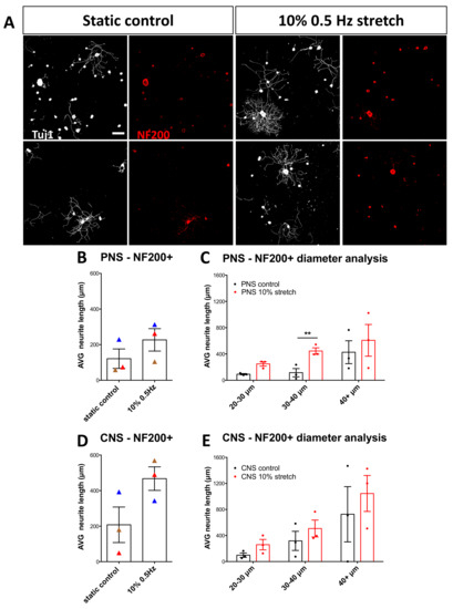 Given that mechanical stretch seems to affect the outgrowth of larger-diameter neurons in vitro in particular, we sought to validate the DRG subpopulation most susceptible to such treatment. Therefore, we began staining with neurofilament 200 (NF200), which stains all A- myelinated fibers [28,29]. Although we observed an overall trend, significance was not reached, which may be due to the high variability with this staining that contains medium Aγ peptidergic nociceptors and medium to large Aβ mechanoreceptors as well as large Aα proprioceptors (Figure 6A,B). Interestingly, when diameter analysis was performed, the 30–40 µm group of the PNS nerve-DRG explant did respond with increased neurite outgrowth. It should be noted that explant and primary culture conditions coupled with the lower cell numbers in the medium to large diameter cell populations leads to high variability between biological replicates.