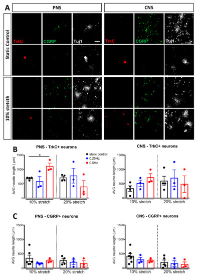 To differentiate the various populations further, we turned to the antibodies for TrkB (Tropomyosin receptor kinase B, the receptor for brain-derived neurotrophic factor and neurotrophin-4 and a marker for mechanoreceptive neurons), parvalbumin (a calcium-binding albumin protein and marker for proprioceptive neurons) and Calcitonin gene-related peptide (CGRP, a marker of peptidergic nociceptive neurons) [30]. Unlike our previous experience with TrkB in tissue sections, in vitro, we struggled to observe specific staining. Parvalbumin failed to stain enough cells for proper quantification. For this reason, we stained large-diameter proprioceptive and mechanoreceptive neurons [31] with TrkC, which is the neurotrophin-3 receptor [32]. We observed that TrkC+ neurons measured on average between 49–57 μm in all experiments conducted. Moreover, we found that TrkC+ neurons did grow after peripheral nerve stretch (Figure 7A,B). This observation was only with 10% at 0.5 Hz, not with lower frequency (0.25 Hz) or increased stretch percentage (20%).