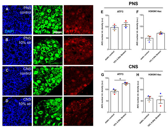 Lumbar DRG-sciatic nerve/central branch explants were dissected as described above (see Section 2.5). Following 3 h of 10% mechanical stretch, DRG were dissected from their respective nerves and fixed with 4% PFA for 4 h at RT. Then, DRG were washed once with 1× PBS and then kept in 30% sucrose solution for 24 h at +4 °C. DRG were cryosected in 18 μm-thick sections. Sections were permeabilized in 0.25% TritonX-100/1× TBS solution and blocked in 5% donkey serum/1× TBS solution for 2 h at RT. Sections were incubated o/n with the primary antibody, anti-ATF3 (Activating Transcription Factor 3, 1:200, rabbit, Novus Biologicals, NBP1-85816, Littleton, CO, USA), anti-H3K9K14ac (Histone 3 lysine 9 lysine 14 acetylation, 1:1000, rabbit, Sigma Aldrich, ZRB06599, St. Louis, MO, USA), and β-III-tubulin (1:2000, mouse, Promega GmbH, G7121, Walldorf, Germany), diluted in 0.25% TritonX-100/1% donkey serum in 1× TBS solution. DRG were washed three times with 1× TBS and then incubated for 1 h at RT with the secondary antibody, AlexaFluor-594 (1:1000, donkey anti-rabbit, Life Technologies, A21207, Carlsbad, CA, USA), AlexaFluor-488 (1:1000, donkey anti-mouse, Life Technologies, A21202, ThermoFischer, MA, USA). DRG were washed three times with 1× TBS and counterstained with DAPI for 15 min. Sections were washed once with 1× TBS and coverslipped with Fluoromount-G.