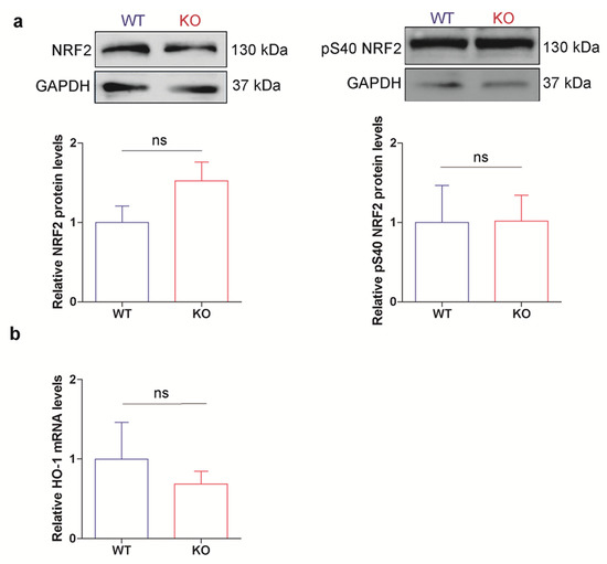 To explore whether NRF2 mediates the exacerbation of HO-1 expression in p53 KO ES cells, we analyzed its status in our experimental system. We found no significant differences between p53 KO and WT ES cells in both total NRF2 and NRF2 phosphorylated at Ser 40 (pS40 NRF2), a post-translational modification (PTM) associated with the activation of this TF [53] (Figure 2a). These results suggest that the differences found in HO-1 levels between these cell lines are not regulated at the transcriptional level. In agreement, no significant changes in HO-1 mRNA levels were observed in p53 KO and WT ES cell lines (Figure 2b), supporting that these boosted HO-1 levels are not due to differential transcriptional regulation and suggesting that a post-transcriptional mechanism might be involved. We hypothesize that the higher HO-1 protein levels found in p53 KO ES cells could probably be due to a cellular strategy to mitigate the stress generated by the lack of p53, in order to restore homeostasis and maintain cellular wellness.