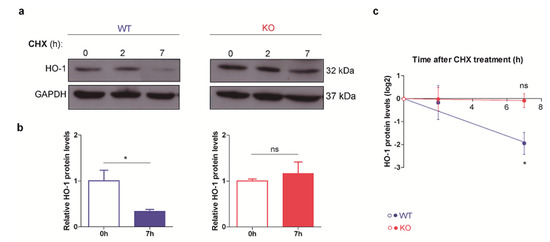 HO-1 half- life is longer in p53 KO embryonic stem (ES) cells. WT and p53 KO ES cells were treated with 10 µM cycloheximide (CHX) during 2 and 7 h. HO-1 levels were analyzed by Western blot. (a) Representative blots of HO-1 in WT and p53 KO ES cells. GAPDH was used as loading control. (b) HO-1/GAPDH band densitometry of vehicle control (DMSO: 0 h) and CHX treatment (7 h). Bars represent the mean ± SEM of three independent experiments. (c) Time-dependent HO-1 expression plot. Dots represent the mean ± SEM of three experiments. Asterisks indicate significant differences compared to the control (*, p < 0.05).