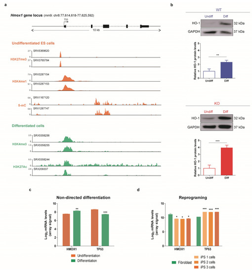 Based on the evidence that HO-1 is involved in stem cells differentiation [37,58,59,60], we analyzed the HO-1 expression in ES cells during this process. First, we exploited ChIP Atlas data-mining platform [61] to investigate histone modifications and the binding of multiple transcriptional regulators to Hmox1 locus in undifferentiated ES cells and in ES cells subjected to differentiation protocols. The examination of the integrated data showed that several proteins associated with transcription repression bind to the Hmox1 regulatory region in undifferentiated ES cells (Supplementary Figure S4a), such as EZH2 and SUZ12, both components of the Polycomb repressive complex, and MBD3 which binds to methylated CpG on DNA, among others. Interestingly, these negative regulators are not associated with Hmox1 in ES cells that were induced to differentiate. Furthermore, the analysis of histone modifications in undifferentiated ES cells displayed two marks commonly associated with gene repression, trimethylation of H3K27 and methylation of H3K4. In these cells, we also detected the repressive cytosine modification, 5-methylcytosine (5-mC). Further, trimethylation of H3K4 and acetylation of H3K27, two marks related to gene induction, were found in differentiated ES cells (Figure 5a). These results support our findings which demonstrate that HO-1 gene expression increases during ES cells differentiation (Figure 5b). Based on this evidence, our next purpose was to explore HO-1 protein levels in p53 KO ES cells during differentiation. For this aim, we studied whether HO-1 expression was sensitive to the differentiation signals in a p53 null context. As shown in Figure 5b, HO-1 expression was also induced in p53 KO cells along differentiation.