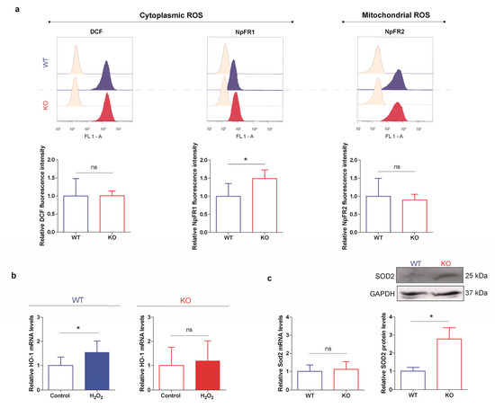 We reasoned that the lack of p53 and the enhanced HO-1 expression could impact on the redox balance of the p53 KO ES cell line. To evaluate this scenario, we first investigated ROS status by measuring their levels with the commonly used H2DCF-DA probe. As shown in the left panel of Figure 6a, intracellular ROS levels were similar in both cell lines. Furthermore, we studied ROS levels with two fluorescent redox sensors that feature higher sensitivity: NpFR1, a flavin molecule that is almost non-fluorescent in its reduced form and its oxidation gives rise to a 125-fold increase in fluorescence, and NpFR2, a mitochondrial-targeted fluorescent redox sensor which can reversibly measure changes in the mitochondrial redox environment [51,52]. While we did not observe any changes using NpFR2, NpFR1 probe allowed detection of slightly higher cytoplasmic ROS levels in p53 KO cells (Figure 6a, middle and right panels) suggesting a mild difference between cell lines. Then, we evaluated the effect of H2O2 treatment, commonly used as an oxidant condition, on HO-1 gene induction and we found that while in WT ES cells HO-1 mRNA levels increased as expected, they were not modified in KO ES cells (Figure 6b). These results further evidence an altered response of the cells undergoing oxidative stress conditions. However, they might also indicate that the cytotoxic effects of H2O2 treatment could be lower in the p53 KO cell line, probably due to the endogenous higher HO-1 levels observed in these cells. Finally, to extend our findings, we explored the expression of Superoxide dismutase 2 (SOD2), a relevant antioxidant enzyme transcriptionally regulated by NRF2 and pluripotency TFs in ES cells [62]. Notably, no differences in Sod2 transcripts were detected in both ES cell lines; however, its protein levels were boosted in p53 KO ES cells (Figure 6c), similar to the results found for HO-1. These data suggest that p53 null phenotype is related to an altered ROS homeostasis in ES cells, which is also associated with a reinforcement of the antioxidant machinery regulated at the post-translational level.