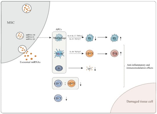 MSC-exosomes exert anti-inflammatory and immunomodulatory effects, which aid in attenuating tissue cell damage. MSC-exosomes perform these functions mainly through interaction of exosomal miRNAs and APCs. They can induce immature and mature DCs to differentiate into tolerogenic DCs, mediating naïve CD4+ T cell differentiation into Tregs. In addition, MSC-exosomes are able to induce macrophages to transform from the M1 to the M2 phenotype while enhancing secretion of M2-related cytokines such as IL-10 and TGF-β and decreasing M1-related cytokine TNF-α, IL-6 and IL-12 levels. With regard to B cells, MSC-exosomes inhibit the maturation and function of B lymphocytes and cause a decrease in IgG secretion. MSC-exosomes also decrease the CD8+ T cell number and the CD8+/CD4+ T cell ratio in the peripheral blood of in vivo mouse models.