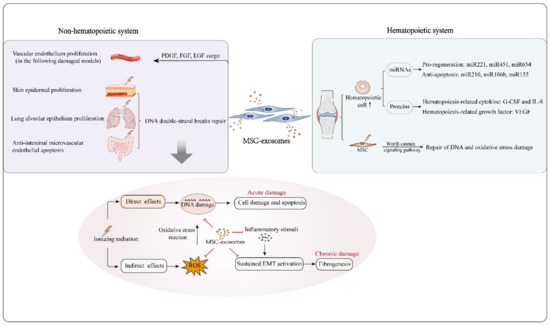 Despite the use of advanced treatment techniques, radiation damage is common and often unavoidable in cancer patients during or after receiving radiotherapy. The actions of ionizing radiation on biological molecules can be segmented into direct and indirect effects. DNA damage in cells can be induced by the direct effects of ionizing radiation, and it can also be caused by the oxidative stress reaction mediated by reactive oxygen species (ROS) generated by indirect effects. Ionizing irradiation-induced DNA double-strand breaks, oxidative stress, vascular damage, and subsequent inflammation are typical events in the acute phase of the pathogenesis of radiation damage, and if these events are not well managed, fibrosis occurs as a pathogenic feature in the chronic phase [55].The potential use of MSCs in repairing radiation-induced acute damage in the hematopoietic system, liver, lung, gastrointestinal tract, or skin has been explored [88,93,94,95], and the results indicate that MSCs have several therapeutic features including increased proliferation and survival of tissue/organ-specific stem/progenitor cells, the promotion of angiogenesis, anti-inflammation and oxidation, and the reduction of fibrotic pathogenesis [96]. The above findings indicate that MSC-exosomes have similar potencies to those of MSCs in repairing tissue or organ damage due to disease. Moreover, recent advances have demonstrated the repair of radiation damage by MSC-exosomes. In the following sections, we elaborate on the therapeutic effects of MSC-exosomes on radiation damage in the hematopoietic system and nonhematopoietic system (Figure 2).