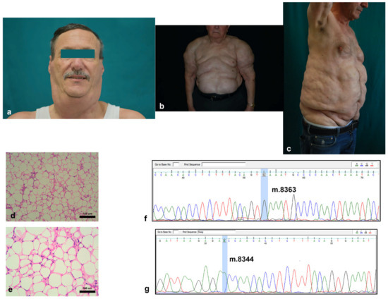 Clinical and histological features of MD: (a–c) representative pictures of typical anatomical localization of excessive adipose tissue in the cervical (a), upper trunk (the pseudoathletic appearance) (b), and abdominal (c) areas of 3 patients with MD; (d–g) representative pictures of hematoxylin and eosin stained adipose tissue sections of an MD patient ((d,e) at 20× and 40× magnification, respectively); and (f,g) representative Sanger pherograms of an MD-derived mitochondrial DNA lacking the presence of both m.8363G > A (f) and m.8344A > G (g) mutations (the interested DNA base positions are highlighted in light blue).