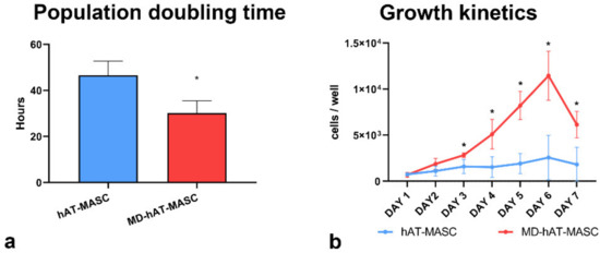 The growth kinetics of MD-ASC and ASC were then evaluated by growth curve analysis. As reported in Figure 3a, the population doubling time (PDT) of MD-ASC was significantly shorter than that of ASC (30.1 ± 5.3 h versus 46.5 ± 6.2 h, respectively). Additionally, while ASC reached a plateau after 3 days, MD-ASC continued to grow with an exponential kinetic up to day 6 (Figure 3b).