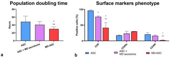 Influence of the MD-ASC secretome on ASC phenotype: (a) histogram comparing the mean population doubling times of ASC, ASC conditioned with MD-ASC, and MD-ASC and (b) surface marker expression comparison of CD9, CD49a, and CD49f in either ASC, ASC conditioned with MD-ASC secretome, or MD-ASC. Results are expressed as mean ± standard deviation. * p < 0.05 vs. ASC cells; ** p < 0.05 vs. ASC + MD-ASC secretome.