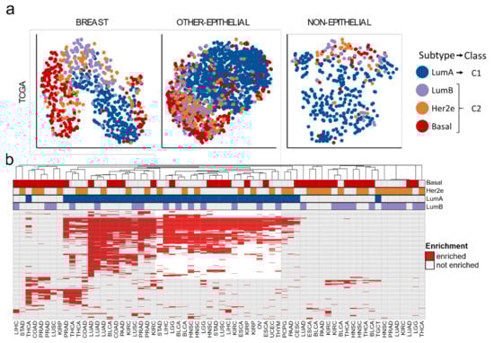 - Zhao, S.G.; Chen, W.S.; Das, R.; Chang, S.L.; Tomlins, S.A.; Chou, J.; Quigley, D.A.; Dang, H.X.; Barnard, T.J.; Mahal, B.A.; et al. Clinical and Genomic Implications of Luminal and Basal Subtypes Across Carcinomas. Clin. Cancer Res. 2019, 25, 2450–2457. [Google Scholar] [CrossRef] [PubMed]