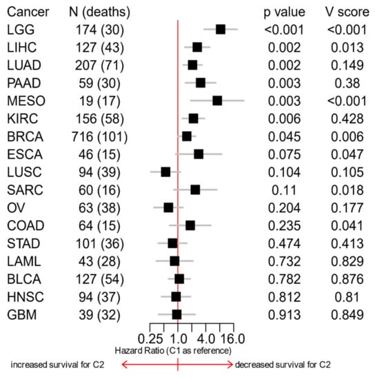 - Hoadley, K.A.; Yau, C.; Hinoue, T.; Wolf, D.M.; Lazar, A.J.; Drill, E.; Shen, R.; Taylor, A.M.; Cherniack, A.D.; Thorsson, V.; et al. Cell-of-Origin Patterns Dominate the Molecular Classification of 10,000 Tumors from 33 Types of Cancer. Cell 2018, 173, 291–304. [Google Scholar] [CrossRef]