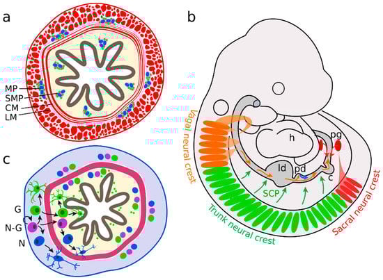 - Nagy, N.; Goldstein, A.M. Enteric Nervous System Development: A Crest Cell’s Journey from Neural Tube to Colon. Semin. Cell Dev. Biol. 2017, 66, 94–106. [Google Scholar] [CrossRef]