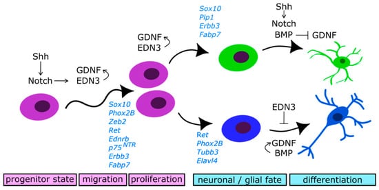 In the small and large intestine, neurons differentiate before glia [52]. Upon neurogenesis, neuronal-fated progenitors maintain the expression of Ret and Phox2B but additionally express the neuron-specific genes Tubb3, Nf, TH, PGP9.5 and Elavl4. As they differentiate, they become negative for glial markers and do not further proliferate [49,52].