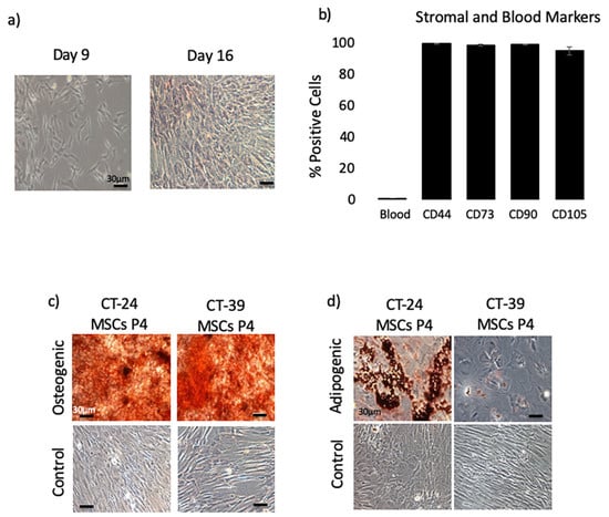 Characteristics of umbilical cord tissue mesenchymal stromal cells (CT-MSCs) isolated through the explant method from cryopreserved primary human umbilical cord tissue. (a) Cell outgrowth at Day 9 and Day 16 post-plating. The cells have a normal spindle-shaped morphology and became confluent after 16 days. (CT-MSC 200). Scale bar =30 µM for all pictures. (b) The cell lines are over 95% positive for the MSC markers (CD44, CD73, CD90 and CD105) and < 1% positive for the hematopoietic markers (‘blood’- pooled; CD34, CD11b, CD19, CD45 and HLA-DR) at passage 4 (n = 5 cords). Standard Error bars (red) are shown. No statistical difference between passages was observed. (c) Passage 2-4 CT-MSCs were cultured in osteogenic differentiation medium for 14 days and stained with 2% Alizarin Red solution for calcium deposits. The control well was grown in α MEM+5% FBS and showed no positive staining. Scale bar = 30 µM for all panels. (d) Passage 2-4 CT-MSCs were cultured in adipogenic differentiation medium for 14 days and stained with Oil Red O to stain lipid droplets. The control well was grown in α MEM+5% FBS and showed no positive staining. Scale bar = 30 µM for all panels.