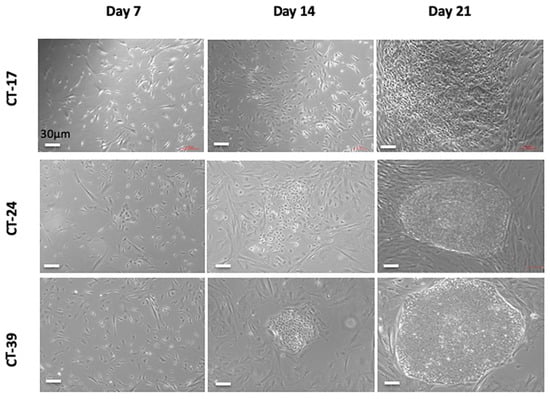 Observed changes to the CT-MSC during reprogramming. The CT-MSCs’ transition throughout the 21 days of reprogramming. Colonies present with a human embryonic stem cell-like morphology with defined boarders and a high ratio of nucleus to cytoplasm. The colonies were then picked and expanded for further characterization. Scale bar = 30 µM for all panels.