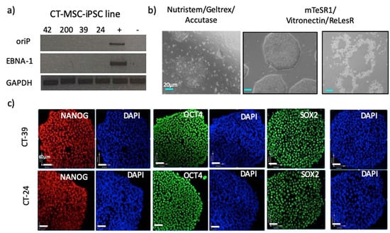 For reprogramming, the CT-MSCs were grown in PRIME-XV MSC Expansion Media (Irvine Scientific, USA) or complete MEM (Gibco, Canada). Human iPSCs were generated using viral-free and non-integrative episomal vectors (Epi5) (Invitrogen, Canada), which carried the reprogramming factors Oct4, Sox2, Lin28, Kld4 and L-myc along with a p53 short-hairpin RNA. One day, prior to transfection, the CT-MSCs were cultured in antibiotic-free media until they were 75–90% confluent. The cells were then detached using Accutase (Stem Cell Technologies, Canada). Approximately 1 × 105 to 1 × 106 cells were transfected with 1 µL of each vector from the Epi5 kit (Invitrogen, USA) using the Neon transfection system (Invitrogen, cat #MPK5000) with the parameters, 1150mV-30ms-2 pulses and 1650mV-30ms-2 pulses. The electroporated cells were then plated onto Geltrex-coated 10 cm plates or 6-well plates (Thermo Fisher, Canada) at 18,000 cells/cm2) when complete MEM was used to a low density (1800 cells/cm2) with PRIME-XV MSC Expansion Media (Irvine Scientific, USA) and incubated for 24 h. On Day 2, the cells were switched to N2B27 Media (DMEM/F12 with 25 mM HEPES (Invitrogen, USA) and 1X N2 supplement (Invitrogen, USA), 1× B27 supplement (Invitrogen, USA), 10 mM MEM NEAA (Invitrogen, USA), 1× Glutamax (Invitrogen, USA), 55 µM B-mercaptoethoanol (Invitrogen, USA), and 100 ng/mL bFGF, 50 µg/mL of ascorbic acid (Stem Cell Technologies, Canada). The N2B27 media was changed every other day for 7 days and then every day for the remaining 2 days. On Day 9, the N2B27 media was replaced with NutriStem media (Biological Industries, USA). This media was changed every other day. Colony formation was noted from Day 21–26, after which colonies were picked for expansion.
