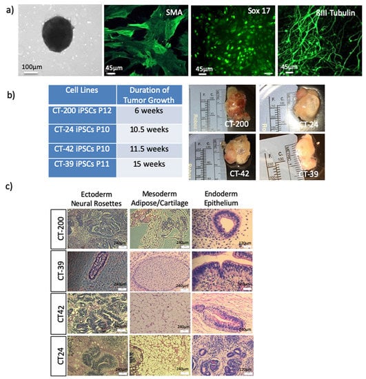 The teratoma assay was carried out to assess in vivo differentiation of the iPSCs lines through the subcutaneous injection of 1 × 107 cells into the dorsal flanks of NOD/SICD mice. The time for palpable tumors to form varied between iPSC lines. Visible growth was seen in the mice anywhere between 4–15 weeks after injection (Figure 4b). All injected lines successfully generated tumors representative of all three germ layers: neural tube (ectoderm), adipose and cartilage (mesoderm) and gut epithelium (endoderm) as assessed by the staff pathologist (Figure 4c).