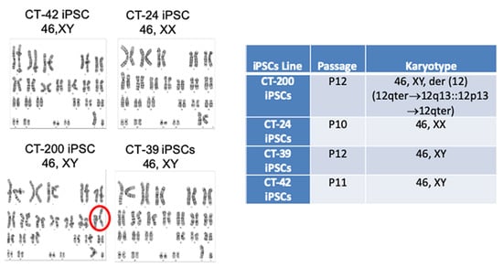 Karyotype analysis of iPSC derived from CT-MSC. Karyotype detected by G-band analysis of representative iPSC lines demonstrates that CT-42 iPSCs and CT-39 iPSCs carry a normal diploid male karyotype and CT-24 iPSCs carries a normal diploid female karyotype. CT-200 iPSCs carries a mostly normal diploid female karyotype with an abnormal chromosome 12 (red circle).