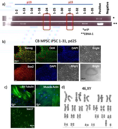 Umbilical Cord Blood Reprogramming. (a) PCR demonstrating the loss of episome vectors from reprogrammed umbilical cord blood (UCB) cells. The episome vector is not present in UCB-iPSC lines 24 and 31. (b) Episome-free UCB-iPSC are positive for the pluripotency markers Oct4, Sox2 and Nanog. Scale bar = 60µm for all ICC panels and scale bar = 20µm for the phase contrast panel. (c) UCB-iPSC were successfully differentiated into ectoderm (ßIII-Tubulin), mesoderm (SMA) and endoderm (Sox17). Scale bar = 46µm for all panels. (d) A normal diploid male karyotype is observed.