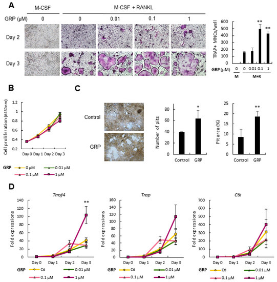 Bone marrow-derived macrophages (BMMs) of five-week-old female ICR mice were used as precursor cells for osteoclasts, as previously described [12]. Mice were euthanized with carbon dioxide. Isolated BMMs were cultured in α-minimum essential medium (α-MEM; Welgene Inc., Daegu, Republic of Korea) supplemented with 10% FBS (Gibco, Co Dublin, Ireland) and 1% penicillin-streptomycin (Thermo Fisher Scientific, Waltham, MA, USA) in the presence of M-CSF (30 ng/mL) for one day and differentiated into osteoclasts using RANKL (100 ng/mL) for three to nine days depending on the experimental condition. Culture media was changed every 2 days. Subsequently, BMMs were fixed with 4% formaldehyde and stained using tartrate-resistant acid phosphatase (TRAP) kit (Sigma Aldrich, St. Louis, MO, USA). The number of TRAP-positive (TRAP+) multinucleated cells (MNCs) with three or more nuclei were counted for evaluation. Bone resorption activity of BMMs was determined using a bone resorption assay kit (Cosmo Bio. Co. Ltd., Tokyo, Japan), according to the manufacturer’s protocol. Briefly, BMMs were seeded in fluoresceinated calcium phosphate-coated microplate and cultured with M-CSF and RANKL in the presence or absence of GRP. After 8 days, pit number and area were analyzed using Image J software after removing the cells from each group in triplicate.