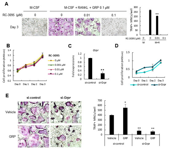 Antagonizing or silencing Grpr abolishes the pro-osteoclastogenic effect of GRP. (A) BMMs were cultured with increasing concentrations of gastrin-releasing peptide receptor (GRPR) antagonist RC-3095. The number of TRAP+ MNCs were quantified on Day 3; (B) CCK-8 assay showed that RC-3095 did not affect BMMs proliferation; (C) The efficiency (~70%) of Grpr gene knockdown in BMMs using siRNA transfection was confirmed by quantitative PCR; (D) CCK-8 assay showed that there are no significant differences in the proliferation of BMMs between si-control and si-Grpr; (E) On Day 8, a significant decrease in osteoclastogenesis is observed in the si-Grpr group as compared with the si-control group. Scale bars, 100 μm. Magnification, ×100. Quantitative data are presented as mean ± SD. * p < 0.05 and ** p < 0.01 by ANOVA test. Asterisk shows a significant difference from the control or vehicle group.