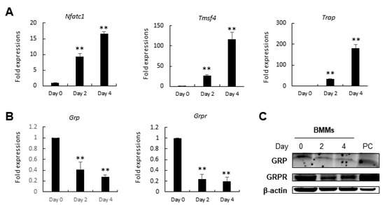 Grp and Grpr expressions are downregulated during osteoclastogenesis. (A) Expression of markers of osteoclastogenic differentiation increased in BMMs during osteoclastogenesis while (B) Grp and Grpr expressions decreased; (C) Protein analysis confirms the downregulation of GRP and GRPR during osteoclastogenesis. 3T3L1 cells at Day 7 were used as a positive control (PC). Quantitative data are presented as mean ± SD. ** p < 0.01 by ANOVA test. Asterisk shows a significant difference from Day 0 group.