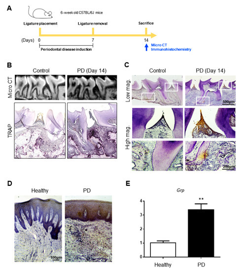 Periodontitis-associated bone resorption and GRP accumulation. (A) Schematic diagram depicting the timing of ligation and sample collection of ligature-induced periodontitis model in mice; (B) Resorption of alveolar bone around the teeth (as indicated by arrows) and the root bifurcation area (as indicated by an asterisk) can be observed in the maxillary section of the periodontitis (PD) group. TRAP staining displayed higher number of TRAP+ cells in the alveolar bone between the maxillary first and second molar (as indicated by an arrow) 14 days after ligation. Histological staining of anti-GRP antibody detected with peroxidase substrate DAB (brown) is prominent in the epithelium of (C) mouse and (D) human gingival tissue samples in PD groups; (E) Quantitative PCR analysis show upregulation of Grp expression in the gingival samples of PD patients. Scale bars as indicated, ×40 for low magnification, and ×100 for high magnification. Quantitative data are presented as mean ± SD. ** p < 0.01 by ANOVA test. Asterisk shows a significant difference from the healthy group.