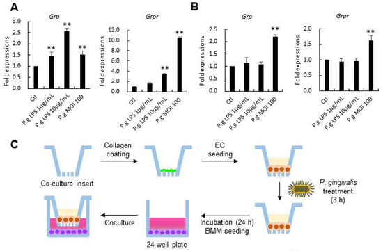 P. gingivalis-stimulated epithelial cells (ECs) can induce the differentiation of BMM. Grp and Grpr expressions in (A) mouse ECs and (B) HaCaTs; (C) Experimental procedure of coculture using ECs and BMMs in non-contact Transwell in the presence of 30 ng/mL M-CSF and 50 ng/mL RANKL to induce osteoclastogenesis; (D) TRAP+ osteoclast formation was promoted in cocultures with P. gingivalis-treated ECs; (E) Preparation of conditioned medium (CM) from P. gingivalis-treated (1 or 10 μg/mL LPS and MOI 100) ECs; (F) BMMs cultured in 20% CM from P. gingivalis-inoculated ECs generated higher number of osteoclasts than the control. Scale bars, 100 µm. Magnification, ×100. Quantitative data are presented as mean ± SD. * p < 0.05 and ** p < 0.01 by ANOVA test. Asterisk shows a significant difference from the control group unless indicated otherwise.