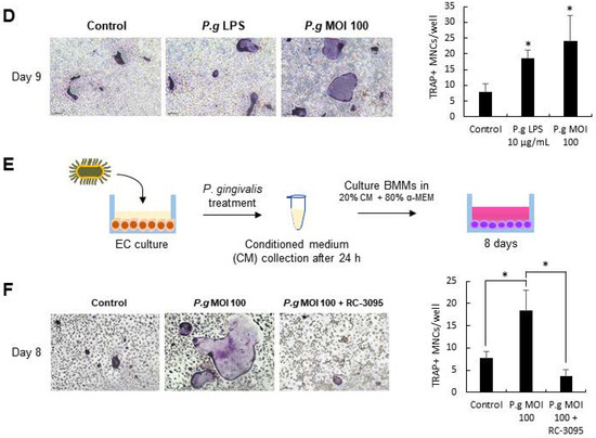 3.5. Lipopolysaccharides (LPS)- or P. gingivalis-Stimulated ECs Induce the Osteoclastic Differentiation of Cocultured BMMs